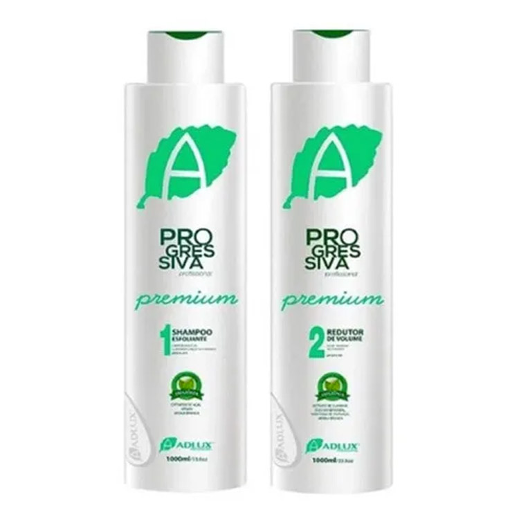 Kit progressiva adlux premium pro20 Descrição 1 shampoo esfoliante 1000ml 1 redutor de volume 1000ml A progressiva redutora de volume adlux é um produto ideal para todos os tipos de cabelos. É um produto diferenciado das escovas tradicionais pois com a adlux no momento de sua aplicação não tem o desconforto de cheiro forte, irritações e ardência nos olhos. Recomendado pelos melhores profissionais de beleza e saúde dos cabelos, realmente a adlux desenvolveu um produto maravilhoso para todos os tipos de cabelos.